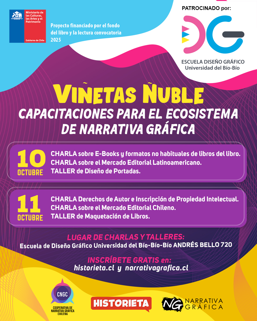 La actividad es posible gracias al Fondo del Libro y la Lectura, Convocatoria 2025 y a la Universidad del Bío-Bío como espacio de acogida para estas capacitaciones, lo que permitirá articular el trabajo artístico con la formación académica de futuros diseñadores y creadores visuales.